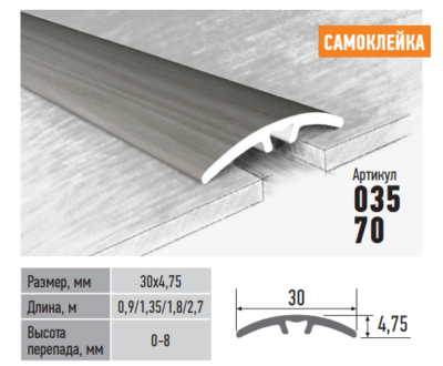 Порог из ламинированного алюминия шириной 30 мм со скрытым креплением. Имеет продольную жесткость. Применяется для соединения стыков между плиткой, ламинатом, паркетом и ковровыми покрытиями, имеющими перепад до 8 мм.