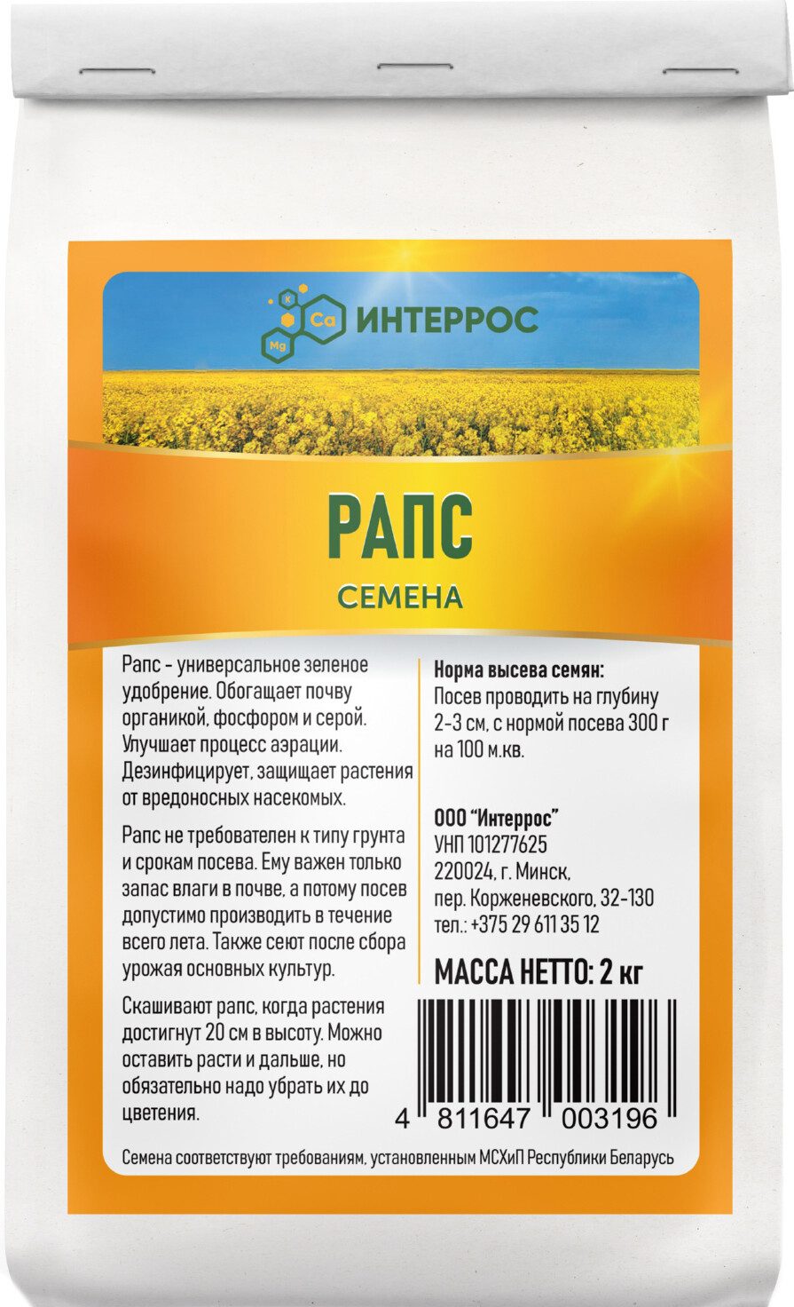 Семена рапса озимого ИНТЕРРОС 2 кг ‒ универсальное зеленое удобрение. Обогащает почву органикой, фосфором и серой. Улучшает процесс аэрации. Дезинфицирует, защищает растения от вредоносных насекомых. Рапс не требователен к типу грунта и срокам посева. Ему важен только запас влаги в почве, а потому посев допустимо производить в течение всего лета. Рапс также сеют после сбора урожая основных культур. Скашивают рапс, когда растения достигнут 20 см в высоту. Можно оставить расти и дальше, но обязательно надо убрать их до цветения.Посев проводить на глубину 2-3 см, с нормой посева 300г на 100 м.кв. Площадь посева одной упаковки 2 кг: 6-7 соток.