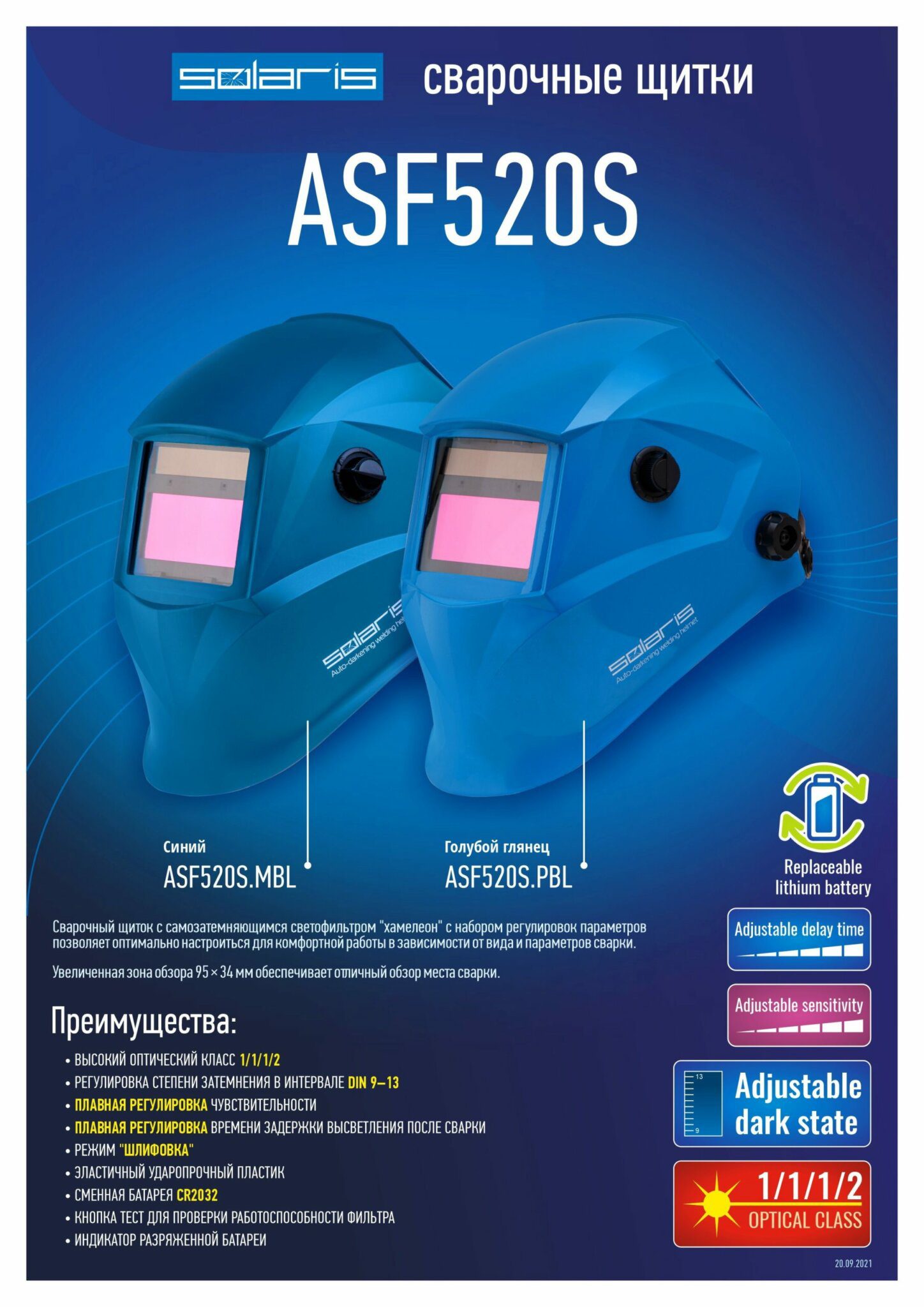 Маска сварочная хамелеон SOLARIS ASF520S голубой глянец (ASF520S.PBL) предназначена для защиты глаз, шеи, лица сварщика от светового и ИК-/УФ-излучения при сварке. Подойдет для начинающих пользователей для периодических работ. Два фоточувствительных сенсора гарантируют срабатывание в различных условиях сварки. Солнечная батарея обеспечивает стабильное питание электроники во время работы. Использование данной модели удобно, поскольку светофильтр автоматически затемняется при зажигании дуги.