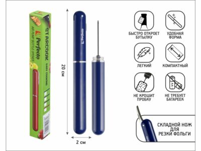 Штопор пневматический PERFECTO LINEA Starcook синий (39-212033) — это современное и удобное устройство для лёгкого и быстрого открывания бутылок вина. Принцип работы основан на использовании давления воздуха: достаточно всего нескольких нажатий, и пробка аккуратно извлекается без повреждений и крошек. Такой способ открывания сохраняет целостность пробки и исключает контакт вина с металлическими элементами.