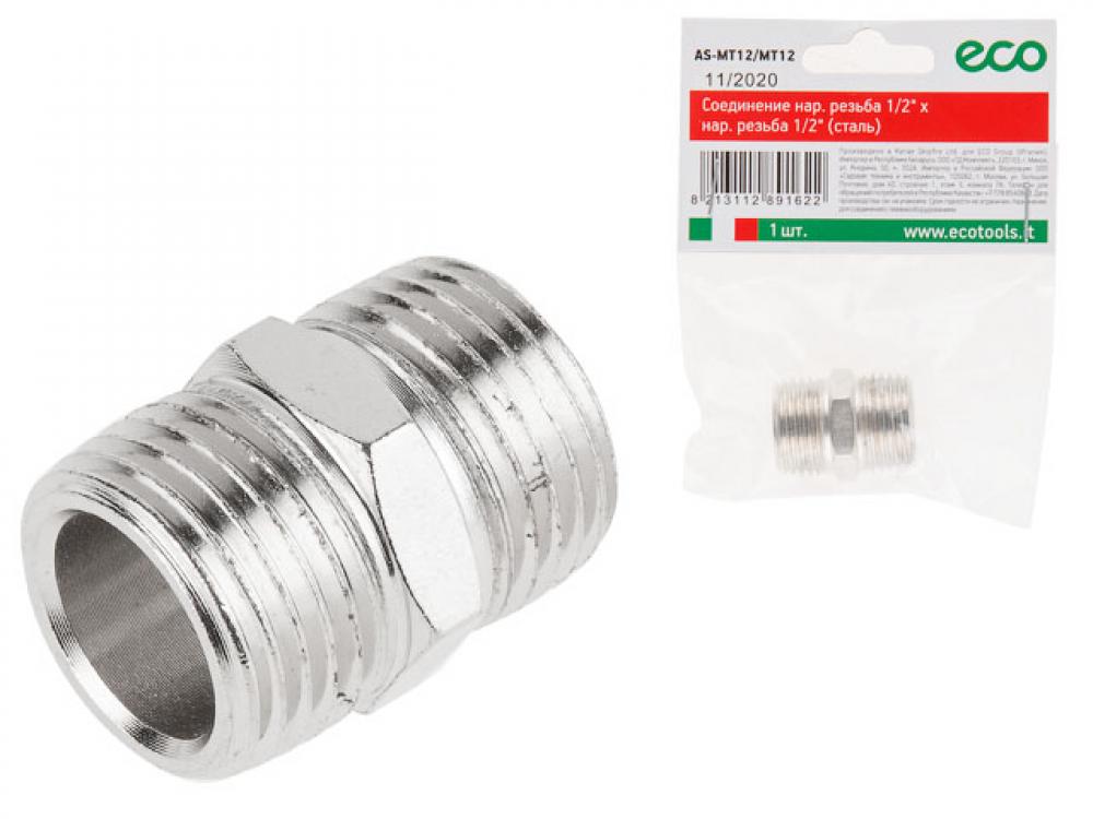 Переходник наружная резьба G1/2 × наружная резьба G1/2 сталь ECO (AS-MT12/MT12) имеет длину 29,31 мм и ширину гайки 5,32 мм.