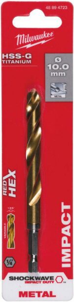 Сверло по металлу 10,0x76x120 мм MILWAUKEE HSS-G-TIN (48894723) с 1/4″ шестигранным хвостовиком оптимизировано для шуруповертов и ударных винтовертов. Угол заточки 135° уменьшает гуляние при засверливании. Конструкция шнека позволяет быстрее выбрасывать стружку. Титановое покрытие распределяет тепло для большей эффективности.