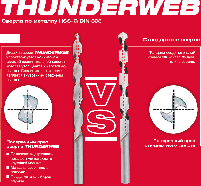 Сверло по металлу 9,0х81х125 мм MILWAUKEE Thunderweb HSS-G (4932352365) характеризуется конической формой соединительной кромки, которая утолщается к хвостовику. Соединительная кромка является внутренним стержнем сверла. Сверло Thunderweb позволяет выдерживать повышенную нагрузку и крутящий момент, имеет меньшую вероятность поломки и продолжительный срок службы. Геометрия сверла способствует быстрому удалению стружки. Открытая форма шнека снижает сопротивление, что особенно важно при сверлении глубоких отверстий. Заостренные режущие кромки обеспечивают чистое и быстрое сверление. 135° на режущей части позволяют совершать точный запуск, быстрое проникновение, требуют меньше усилий / давления подачи. Сверло отлично подходит для бурения на изогнутых поверхностях. DIN 338.