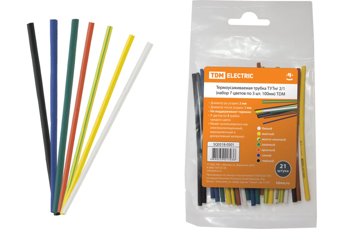 Термоусаживаемая трубка ТУТнг 2/1 набор (7 цветов по 3 шт. 100мм) TDM может использоваться как электроизоляционный, маркировочный и декоративный материал.