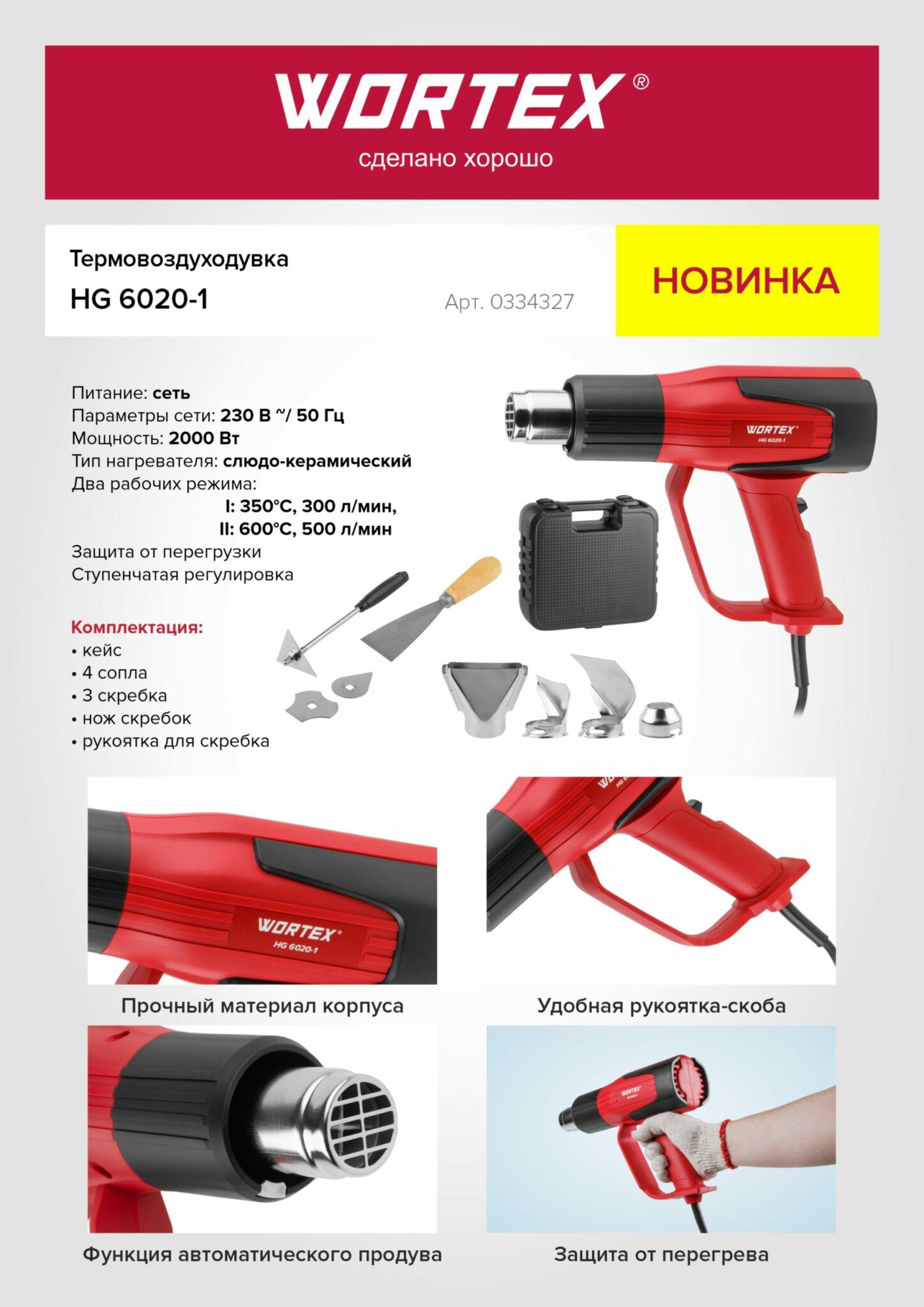 Фен строительный (термовоздуходувка) WORTEX HG 6020-1 (0334327) — многофункциональное устройство, которое применяется для снятия краски с поверхностей, придания формы изделиям из пластика и удаления клеевого слоя. Модель имеет удобную ручку-скобу, а также ступенчатую регулировку, состоящую из двух режимов. Имеется функция автоматического продува, что позволяет инструменту быстрее охладиться после окончания работы. Защита от перегрева.