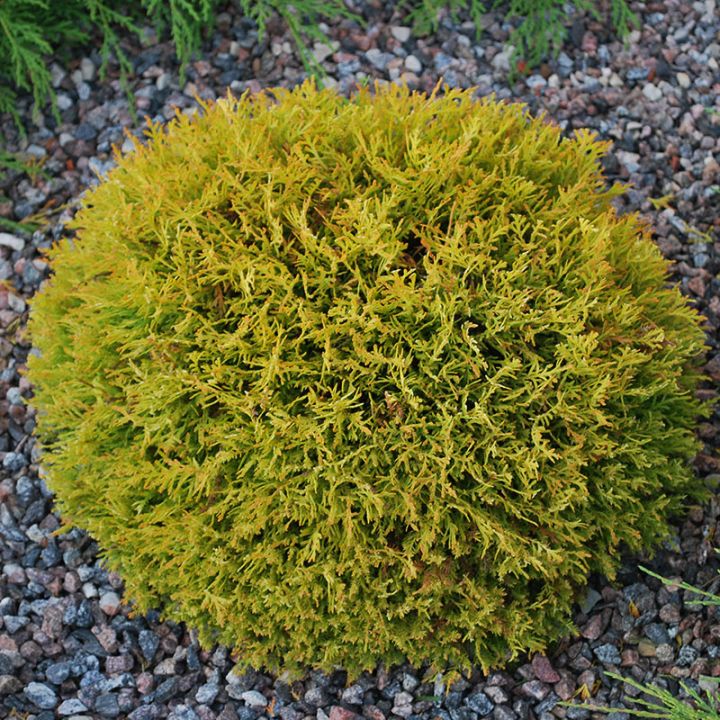 Туя западная Даника Аурея – очень удачная разновидности туи Danicа. Появившись в 2002 году в одном из нидерландских питомников, она быстро распространилась по миру, заставив ландшафтных дизайнеров и садоводов пересмотреть свое виденье идеальных пейзажей. Ей выделяли и выделяют самые видные места в саду, хотя о быстрых темпах роста сорта не может быть и речи. Тем не менее, она занимает лидирующие позиции среди компактных хвойников и не собирается менять свои планы. Туя западная Danica Aurea уверенно устремляет вверх свои вертикальные побеги, плотно примыкающие друг к другу, наращивает плотную и абсолютно круглую крону, не нуждается в формирующей обрезке и не сбрасывает хвою. Последняя лишь может менять окраску с золотистой на лимонную и обратно.