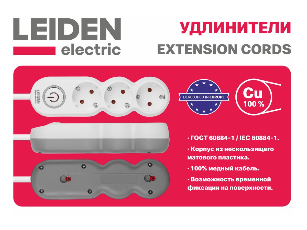 Удлинитель 7 м 4 розетки 2,2 кВт с заземлением LEIDEN ELECTRIC (805028) предназначен для одновременного подключения нескольких электроприборов, подходит для эксплуатации в жилых и офисных помещениях. Корпус выполнен из качественного нескользящего матового пластика. 100% медный кабель имеет высокую электро- и теплопроводность, устойчив к изломам и коррозии, обеспечивая долгий срок службы. Благодаря специальным отверстиям на корпусе, изделие может фиксироваться на поверхности.