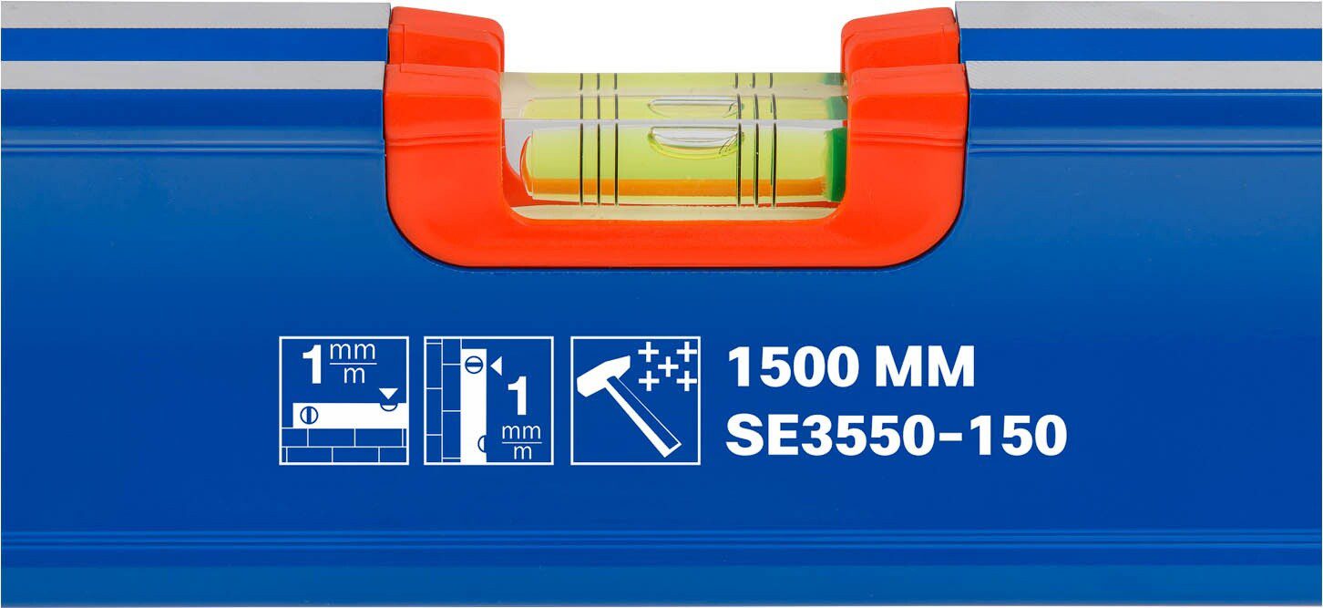 Уровень STARTUL Expert SE3550 1500 мм (SE3550-150) длиной 1,5 метра имеет ударопрочный X-профиль, выполнен из алюминия. На корпусе установлены 3 акриловые блочные колбы небьющиеся (1 колба – измерение горизонтали, 2 ватерпаса – измерение вертикали). На концах изделия имеются пластмассовые концевые колпачки. Прорезиненные ручки для более удобного захвата. Надежный и прочный инструмент в помощь, как профессиональному строителю, так и домашнему мастеру.