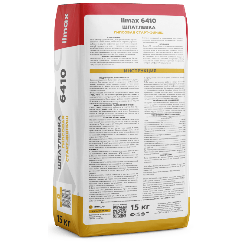 Шпатлевка гипсовая старт-финиш ILMAX 6410 белая 15 кг предназначена для выравнивания шероховатостей, неровностей, заделки стыков гипсокартонных листов с использованием армирующей ленты, заполнения царапин, трещин, выбоин и других дефектов с целью получения идеально ровной и гладкой поверхности стен и потолков. Используется по минеральным поверхностям из гипсовых, цементных и цементно-известковых штукатурок, гипсокартонных и гипсоволокнистых листов, гипсовых плит, бетона. Рекомендуется для внутренних работ в сухих помещениях с их последующей отделкой (окраска, оклейка обоями). Можно наносить в несколько слоев. Производится из экологически чистых природных материалов, не содержит вредных для здоровья веществ.