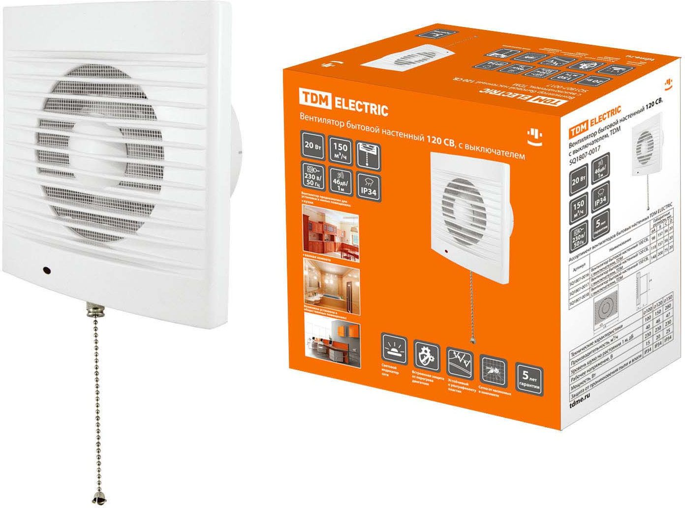 Вентилятор 120 СВ TDM (SQ1807-0017) предназначен для вытяжной вентиляции санузлов, душевых, кухонь и других бытовых и общественных помещений. Имеет удобный шнур-выключатель. Корпус и крыльчатка вентилятора выполнены из высококачественного АБС-пластика, устойчивого к воздействию ультрафиолета. Конструкция крыльчатки позволяет повысить производительность вентилятора и срок службы двигателя. К преимуществам можно отнести встроенную защиту двигателя от перегрева, защитную сетку от насекомых в комплекте, световой индикатор на передней панели вентилятора.
